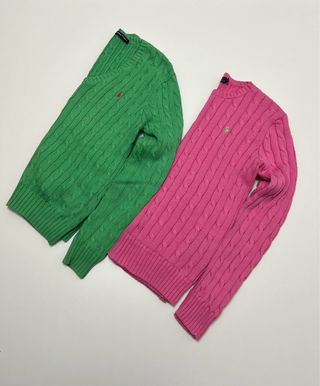 Conjunto de dos jerséis de punto trenzado de Ralph Lauren. - Jersey verde con logo rojo. - Jersey rosa con logo verde.