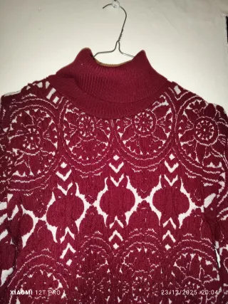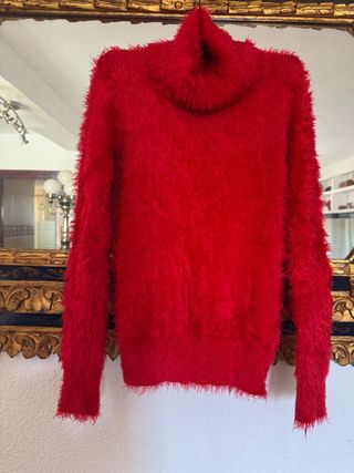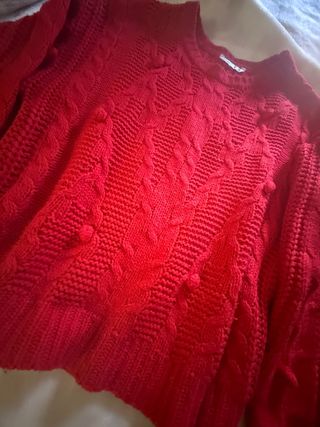 Jersey de punto con cuello alto y manga larga. Presenta un diseño calado en las mangas. - Talla L/XL. - Color rojo vibrante. - Tejido suave y cálido.