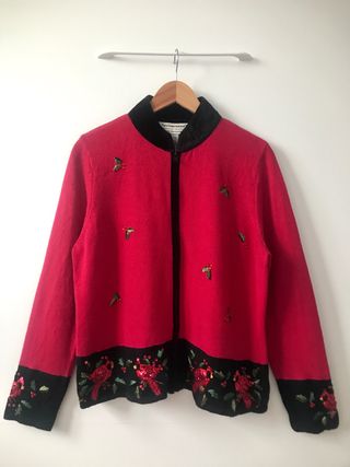 Cárdigan de punto con un diseño festivo y detalles llamativos para un toque de glamour. Marca: Tiara International Color: Rojo, negro Talla: L Comprobar medidas para asegurar el ajuste perfecto! Medidas: (ver fotos) - Hombros: 40 cm - Sisa a sisa: 52 cm - Largo: 60 cm - Manga: 60 cm Material: 59% ramio, 32% algodón, 8% nailon, 1% spandex Detalles: - Cuello de terciopelo, cremallera completa - El bajo y los puños lucen un diseño de cardenales posados entre hojas de acebo y bayas, adornado con delicados abalorios y lentejuelas. Estado: Muy bueno, sin defectos. Descubre más jerseys en mi perfil. ¡Haz pack y ahorra en el envío.