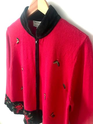 Jersey de manga larga de color rojo vino con bordados en formas de flor y cuentas redondas, de color rojo, cosidas. Talla M/L (tirando más a M). Marca Last Woman. Vintage, comprada a principios de los 90. Composición: 45 % lana, 45 % acrílico y 10 % nailon. Buen estado general, poco uso.