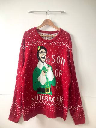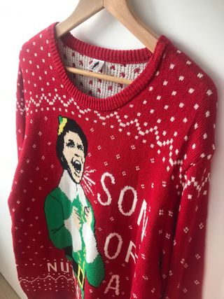 Jersey navideño con un divertido motivo de Buddy de la película Elfo. Marca: Elf (con licencia oficial) Color: Rojo Talla: XL Comprobar medidas para asegurar el ajuste perfecto! Medidas: (ver fotos) - Hombros: 48 cm - Sisa a sisa: 60 cm - Largo: 80 cm - Manga: 77 cm Material: 100% acrílico Detalles: - Estampado gráfico grande de Buddy y texto “Son of a Nutcracker” Estado: Muy bueno, sin defectos. Descubre más jerseys en mi perfil. ¡Haz pack y ahorra en el envío!