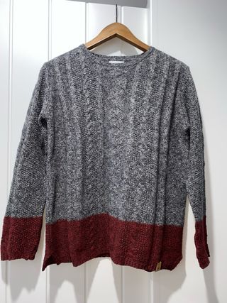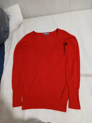 Jersey de punto con cuello en V y detalles en contraste. Color rojo y gris. Talla M.38. Poco uso. Medidas: Axila a axila 50 Largo 68cm - Manga larga. - Puños y cuello con acabado acanalado. - Pequeño detalle de logo en la parte inferior.