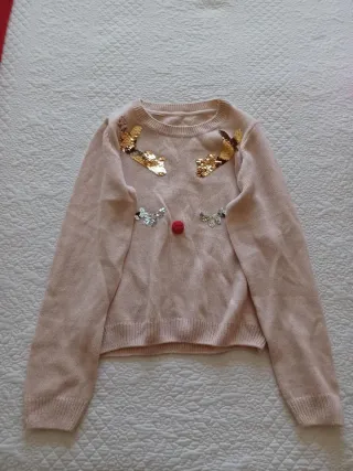 Jersey de punto fino para niña, con un divertido diseño de reno navideño. Cuello 17 cm Ancho 37 cm Alto 47 cm - Color rosa claro. - Adornado con lentejuelas doradas y plateadas. - Detalle de nariz roja. - Mangas largas y cuello redondo.