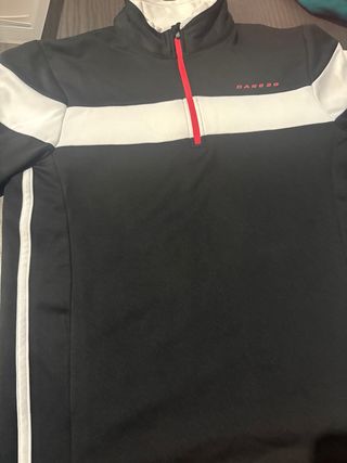 Jersey deportivo de manga larga con cremallera. - Diseño con franjas blancas en el pecho. - Detalle de cremallera roja. - Ribete blanco en los laterales.