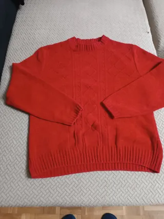 Jersey de color rojo, talla M, con cuello largo, ideal para los días de frío. Está en muy buen estado, bien cuidado y sin defectos. Cómodo, calentito y fácil de combinar para looks de diario.