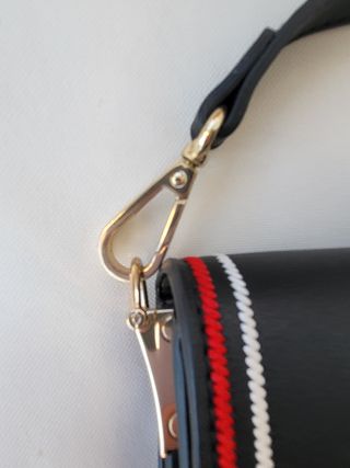 Elegante bolso con un diseño moderno y llamativo. - Acabado en color negro. - Ribetes decorativos en color rojo y blanco. Jersey boho verde.