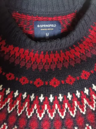 Precioso jersey en rojo y blanco, comprado en la tienda Tricot. Lana 100 % Es grueso y abriga mucho. Está muy cuidado, es de los años 80. Tanto por delante como por detrás tiene el mismo dibujo La talla podría ser M o L. No lleva etiquetas por ser hecho a mano. Medidas: - Distancia entre los hombros 49 cm. - Mangas 42 cm - Largo 57 En las fotos finales se ven las medidas.