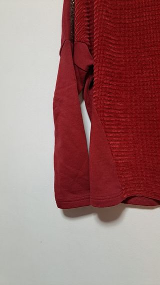 Jersey/sudadera color rojo oscuro, doble tejido, parte delantera aterciopelada y parte trasera tejido tipo sudadera, es de Salsa, talla M, detalle de brillantes en hombros.