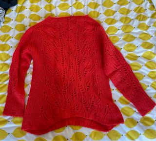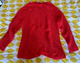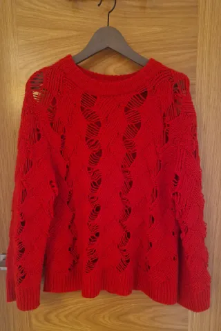 Jersey de punto calado rojo de Parfois. Cuello redondo amplio. Talla XS/S pero es más bien flojito. Composición: 37% acrílico, 31% lana, 30% poliamida y 2% poliéster. Está perfecto, como nuevo, usado como mucho solamente un par de veces.