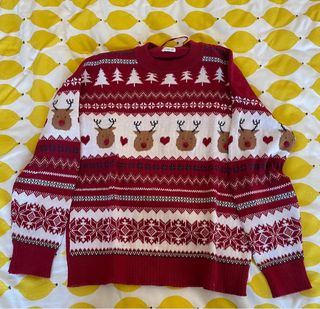 Jersey de punto con diseño navideño. - Estampado de renos y árboles de Navidad. - Patrones de copos de nieve y corazones. - Cuello redondo y manga larga.