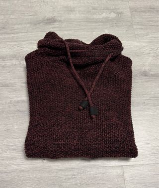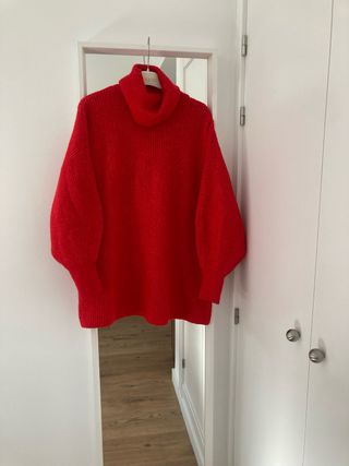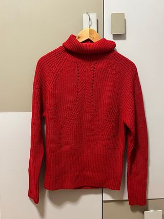 Jersey de punto grueso en color rojo, con un diseño moderno y desgastado.