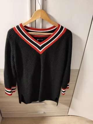 Jersey de punto con cuello en pico y detalles de rayas. Precio negociable. - Diseño de cuello en V. - Puños con detalle de rayas. - Aberturas laterales. - En la etiqueta pone talla S pero es talla L realmente. - Jersey ancho negro. - Totalmente nuevo, sin uso