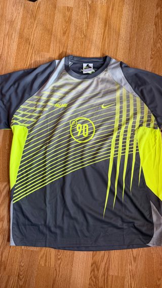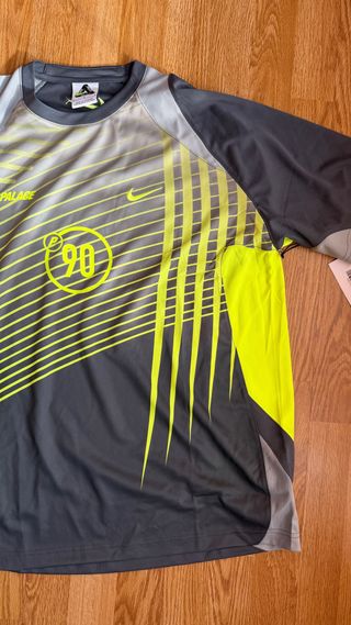 Camiseta deportiva de la colaboración entre Palace y Nike, modelo Total P90. - Talla L. - Diseño con detalles en amarillo neón y gris. - Sin usar.