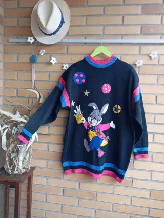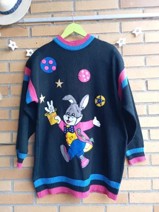 Jersey vintage con un divertido diseño de conejo en el espacio. Ideal para añadir un toque retro y original a tu armario. - Estampado de conejo con traje y elementos espaciales. - Puños y bajo con rayas de colores. - Cuello redondo.