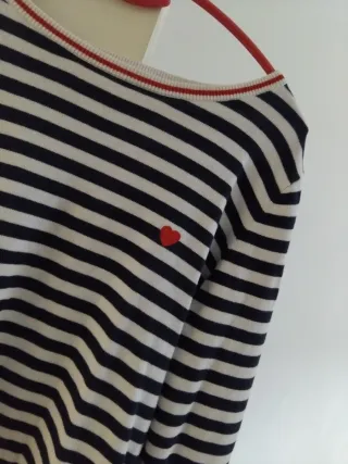 Jersey de rayas marineras con un pequeño detalle de corazón rojo y efecto camisa en bajo. - Cuello redondo. - Manga larga. - Bajo con detalle de tejido vaquero. - Mangas con botones decorativos.