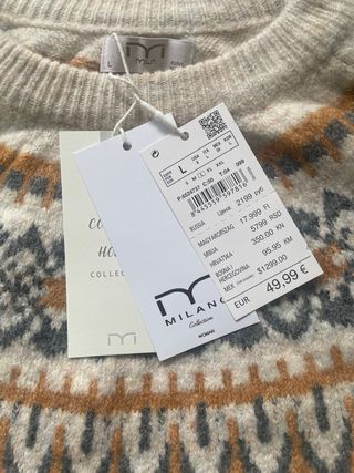 Jersey de punto con diseño nórdico. - Cuello redondo. - Manga larga. - Estampado jacquard en pecho y puños. - Bajo con banda de punto. - 57 % poliéster 28 % acrílico 13 % poliamida y 2 % elastano Precio no negociable. Se hace envío a cualquier lugar