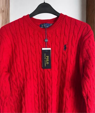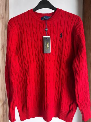Jersey de punto trenzado en color rojo. - Diseño clásico con cuello redondo. - Logo del jugador de polo bordado en el pecho. - Puños y bajo acanalados.