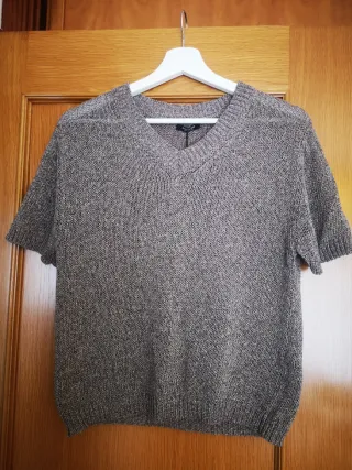 Jersey de punto fino con cuello en pico. - Manga corta. - Tejido jaspeado Color gris topo, muy fresquito y favorecedor. De poliéster y poliamida. A estrenar