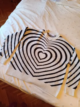 Jersey de punto con un llamativo diseño de corazones concéntricos en blanco y negro. Está en muy buen estado, como nuevo. - Diseño de corazón. - Tejido de punto. - Talla M.