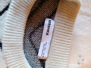 Jersey de punto de la marca Stradivarius con estampado geométrico, de rombos y figuras, colores negro y blanco o crema, cuello semi-barco, aberturas en los laterales zona inferior. Talla L.