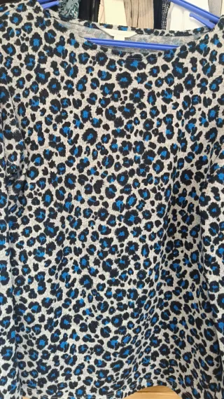 Jersey de punto con estampado de leopardo en tonos azules y grises. Un diseño llamativo y moderno. - Cuello redondo. - Manga larga. - Tejido suave y confortable.