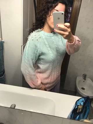 Jersey de punto con un diseño degradado y detalles de perlas. Practicamente sin usar. Diría que es talla L, pero teneis las medias en las fotos.