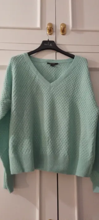 Jersey de punto fino en color verde azulado, de diseño con textura y un favorecedor cuello en pico. Talla L. A estrenar - Tejido de punto con relieve. - Cuello en V. - Manga larga.