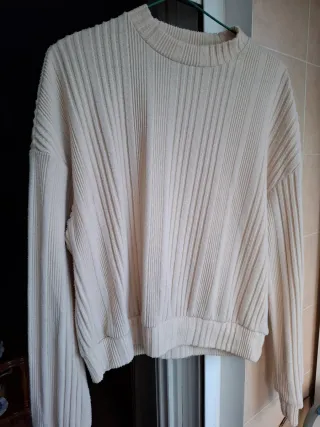 Jersey de punto con un diseño acanalado vertical que le da un toque moderno y elegante. Su color beige lo hace muy versátil. -talla L, medidas en la foto - Tejido suave y agradable al tacto. - Corte moderno y favorecedor. - Cuello redondo.