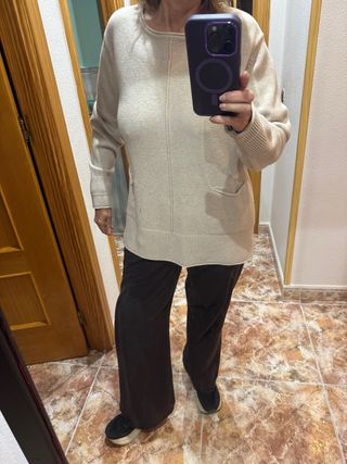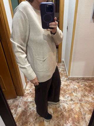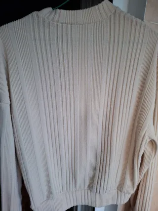 Jersey de punto fino de la marca Zara en color beige. - Cuello redondo. - Manga larga. - Bajo y puños de canalé. Aunque es de talla XL, queda más pequeño como una L