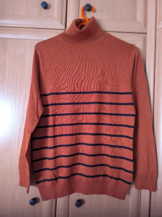 Jersey mujer cuello alto color tabaco con rayas azul marino #Unit talla L Está en perfecto estado,tan solo tiene unas pequeñas manchitas decoloradas debajo del puño y un poco en la parte de abajo (está apenas se distingue )se aprecian en las fotos,