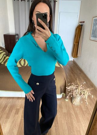 #donna_anabrotons #size_m_anabrotons #sweaters_anabrotons ⭐️ Prenda VINTAGE 🧶 Donna jersey verde turquesa Made In Spain talla 44. Talla pequeño recomiendo para talla M/L 📝 tacto suave gustoso, escote pico, cuello alto, botones en puños, acabado en rib 💰 pagado 189€ boutique 🏷️ nuevo sin uso 📏 medidas en plano: 38 cm de hombro a hombro, 45 cm de sisa a sisa, 40 cm de cintura, y 56 cm de largo #idearegalo #enviorapido #enviorapidoyseguro #nuevoaestrenar #nuevosinetiqueta #donna #jerseyverde