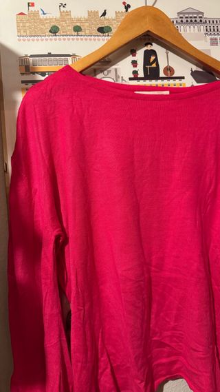 Jersey fino de manga larga en color fucsia. - Cuello barco. - Bajo con acabado ondulado. - Tejido ligero y transpirable.