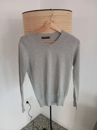 Jersey de punto fino color gris con cuello en pico. Sin usar. - Manga larga. - Diseño liso. - Bajo y puños acanalados.