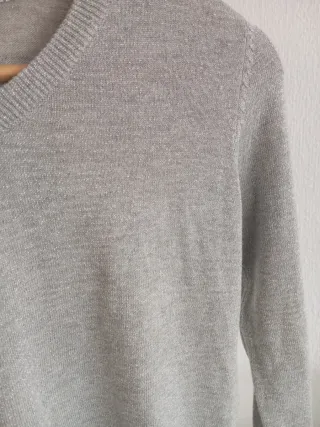 Jersey de punto fino con un toque brillante, perfecto para añadir un detalle especial a tu look. En la etiqueta ponen la talla XL pero es una 40/42. En la última foto está la medida. - Diseño con escote en V. - Tejido con pequeñas lentejuelas dispersas. - Manga larga.