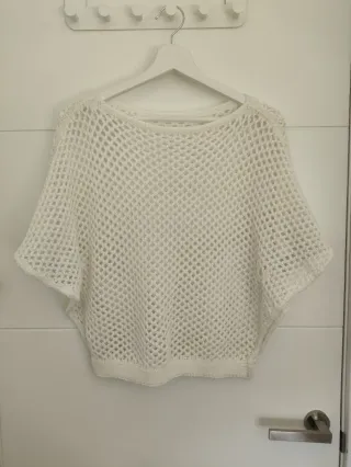 Jersey de punto calado en color blanco. Es una prenda ligera y versátil, para llevar una camiseta debajo y que se aprecie el calado. - Diseño de punto abierto. - Manga corta tipo murciélago. - Cuello redondo. Mira mi perfil, hay muchas cosas interesantes a buen precio Consúltame el tiempo de envío. Hay veces que por mi trabajo no lo puedo enviar en el plazo que marca la aplicación.