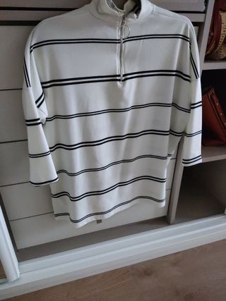 Jersey de punto con un diseño clásico de rayas horizontales. La parte superior es de color negro liso, mientras que el resto del jersey presenta un patrón de rayas alternas en negro y blanco. - Manga larga. - Cuello redondo. Talla L pequeña, recomiendo para m.una única puesta, como nuevo