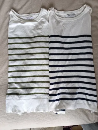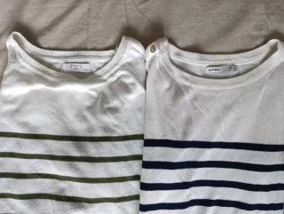 Conjunto de dos jerseys de rayas para mujer. - Jersey blanco con rayas verdes. - Jersey blanco con rayas azul marino. - Talla L.