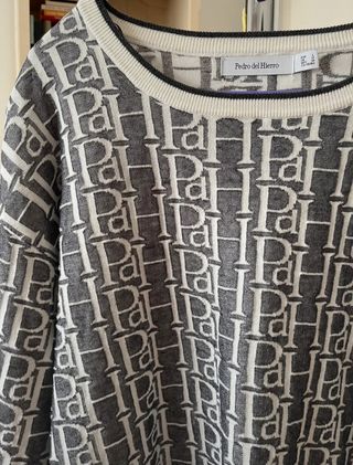 Jersey de punto, rayas horizontales, no pone talla ni marca, es como una M, pero cede bastante y es hueco, perfectamente sirve para quien use talla L también. Colores negro, crudo, gris y dorado. Usado solo en una ocasión, impecable. Muchas ofertas y novedades en mi armario