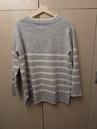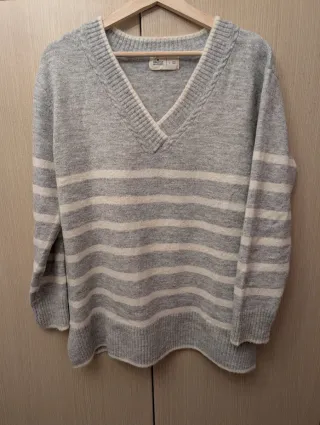 Jersey de punto con diseño de rayas horizontales en gris y blanco. Cuello en pico y manga larga. Utilizado dos días. Lo vendo porque he engordado...