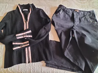 Pantalón de Cortefiel talla 40 con tachuelas en bolsillos como nuevo jersey negro de regalo MG . Chaqueta original con cremalleras de piedras Swarovski buena calidad - Chaqueta de punto con cremallera y detalles rosas. - Pantalón con tachuelas en los bolsillos.