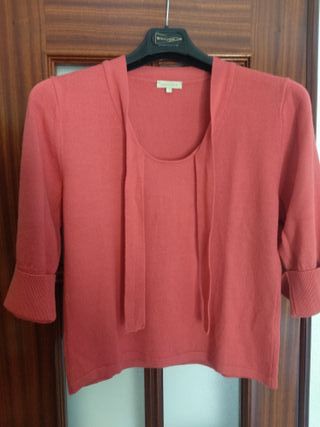 Conjunto de rebeca y jersey de hilo en talla L. El jersey es azul marca Italian Yarn ( echo en España)y el cárdigan es salmón de massimo Dutti. - Jersey de punto con diseño texturizado. - Rebeca abierta de punto fino.
