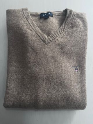 Jersey de pico en color beige de la marca GANT. Un básico atemporal para tu armario. - Cuello en V. - Tejido suave y confortable. - Lana - Talla L En perfecto estado, como nuevo.
