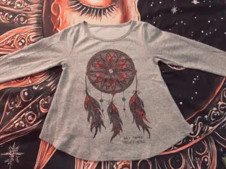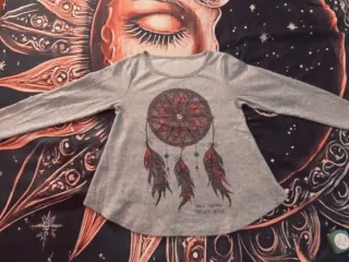 Jersey de manga larga con un diseño de mandala y plumas. Talla entre 40/42. Tejido suave , muy agradable. - Diseño de mandala central. - Detalle de plumas colgantes. - Manga larga.