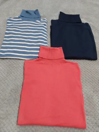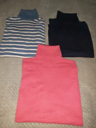 Conjunto de tres jerseys de cuello alto, perfectos para añadir a tu armario. - Jersey azul con rayas blancas - Jersey azul marino - Jersey rosa Entrego en la plaza de Tirso de Molina o glorieta de embajadores. PRECIO NO NEGOCIABLE. PAGO EN EFECTIVO.