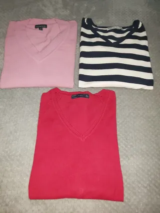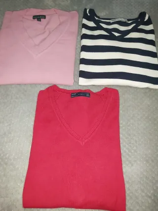 Conjunto de tres jerséis de punto. - Jersey rosa con cuello en V. - Jersey a rayas azul marino y blanco con cuello en V. - Jersey rojo con cuello en V. Entrego en la plaza de Tirso de Molina o glorieta de embajadores. PRECIO NO NEGOCIABLE. PAGO EN EFECTIVO.