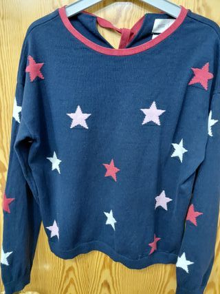 Jersey de punto azul con estampado de estrellas en varios colores. Talla amplio, como XL. - Cuello redondo. - Detalle de lazo en la espalda. - Manga larga.