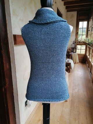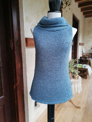 Precioso jersey de punto azul, sin mangas y de cuello alto. Es de talla L., aunque es algo pequeño - Tejido de punto suave y agradable al tacto. - Diseño elegante y versátil. - Ideal para cualquier ocasión.