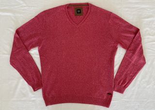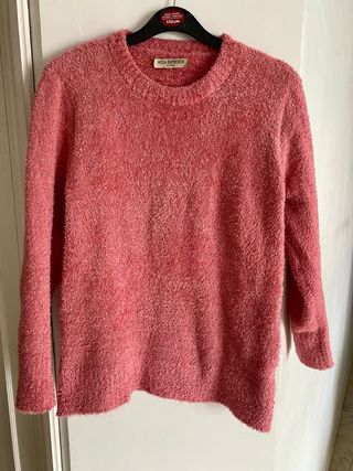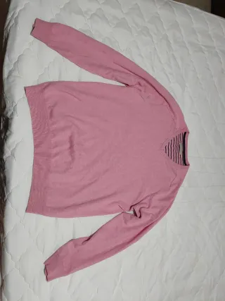 Jersey marca: Pedro del Hierro. Talla L. Ver medidas en fotografía 5 (tomadas en plano, sobre una mesa). Cuello de pico. Color: rosa (en realidad, punto rosa y blanco). En muy buen estado; usado muy pocas veces. Entrega en mano o envío a través de Wallapop