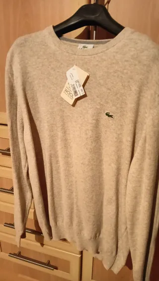 Jersey de lana 80% y poliamida 20% que le da un carácter adaptable al busto. Con elasticidad en cintura y mangas. Marca Lacoste en color beige. Un Regalo especial para alguien o un básico atemporal para tu armario. Prestancia de su doblado original, nunca se ha usado, ni probado, impoluto absoluto. Lo notaras al verlo y tocarlo. Es una talla 6 Lacoste que corresponde a una L / XL, si tienes dudas, solicitame las medidas que quieras y te las mido. - Tejido de lana de muy alta calidad, muy agradable al tacto. - Diseño clásico y versátil. Comprado Rebajas hace 1 año con precio inicial de 136 € y rebajado a 108 € en el Corte Ingles.