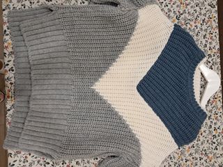 Jersey de punto grueso con diseño de rombos y bloques de color. Es una prenda cómoda y versátil. Aunque pone xs equivale a una talla M o L - Diseño de rombos en la parte superior. - Combinación de azul, blanco y gris. - Tejido de punto grueso.